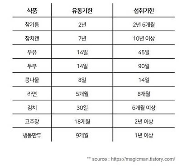 현재 우리나라는 대부분 유통기한이 섭취기간으로 생각하고 있는데, 제품별로 상하는 정도가 달라 유통기한이 지나도 먹을 수 있는 것과, 유통기한이 지났다면 빨리 먹어야 하는 것은 또 구별되는 것이라고 합니다.
