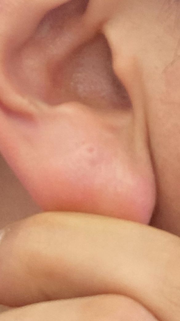 가운데가 까만색은 아니고 살색이랑 비슷하고 가운데가 뚫려있고 통증이나 간지럽거나 그러진 않구요. 오른쪽 귀가 조금 더 크고 왼쪽 귀에도 있습니다.