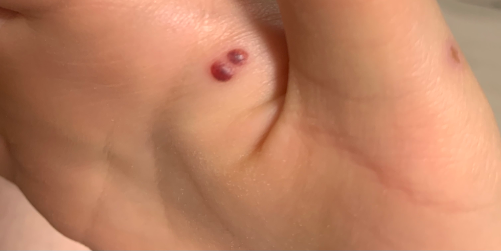 현재로선 사진만으로 판단은 어렵습니다. 수포안 혈액으로 추정되는 액체가 들어 있을 가능성이 높아 외상으로 인해 발생한 상처의 가능성이 있으나 내원하여 진료를 받아보시는 것이 좋겠습니다.