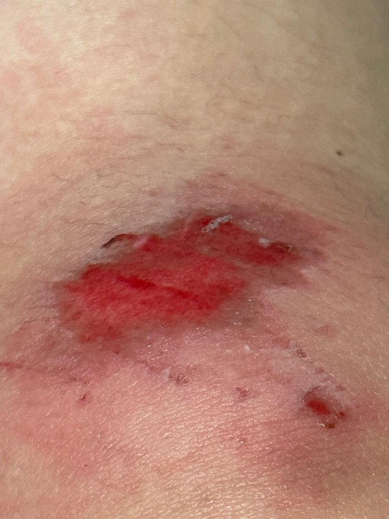 19일 수요일에 다쳤고 다치자마자는 식염수 세척 후 이지덤 붙였고 약국 갔더니 연고에 드레싱 밴드 붙이는 것이 좋다고 해서 하루정도 그렇게 하다가 다시 듀오덤 붙이고 있습니다. 새로 밴드를 갈 때는 계속 흐르는 식염수로 닦고 있습니다.그런데 진물 양은 줄지 않아 진물이 계속 줄줄 새어 몇시간에 한번씩 갈아주고 있고 괜히 갈수록 통증이 더 심한 거 같고 무릎 구부리기도 힘이 들어 절뚝거리게 됩니다.