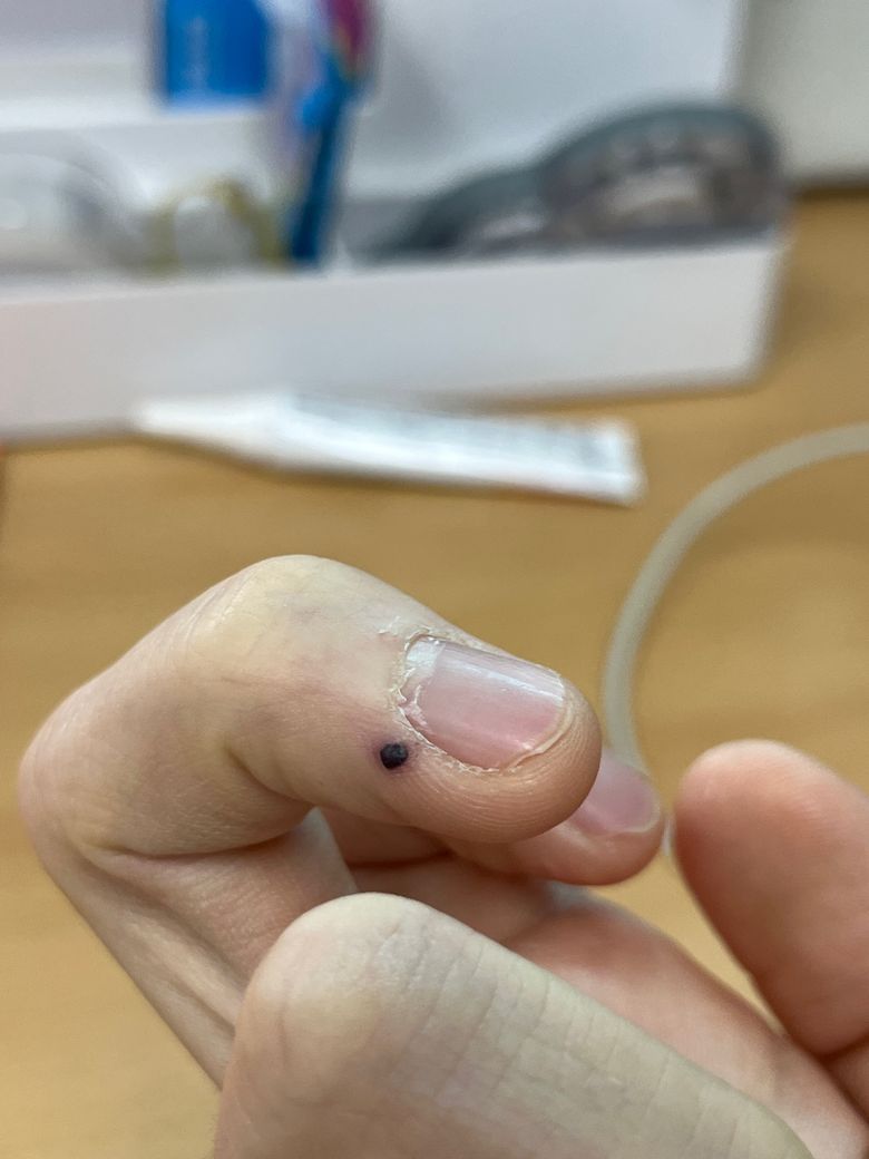 단순 혈관종 가능성이 제일 높습니다. 사진상 병변은 손톱 옆 피부에 위치한 약 2~3mm 크기의 검은색 구형 병변으로 보이며, 표면이 비교적 매끈하고 약간 융기되어 있습니다. 압통이 있고 말랑한 촉감이라는 점이 중요한 단서입니다.