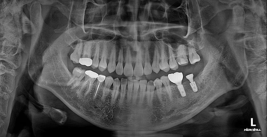 왼쪽 아래 끝에 어금니 자리입니다. X-ray사진으로 지대주까지 설치된 곳입니다.