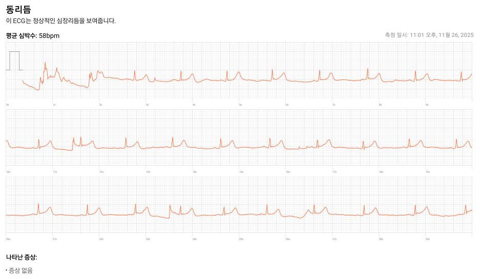 일단은 이야기 하신 것처럼 스마트워치의 심전도 기능은 어디까지나 참고 정도로만 보아야 합니다. 제대로 된 의학적인 판단을 내릴 수 있는 정밀한 결과를 얻을 수 있는 기능은 아닙니다. 각설하고 동성 리듬에 규칙적으로 잘 뛰고 있으며 중간중간 움직임 등에 따른 잡음이 보입니다. 특별히 심각한 이상이 있어 보이거나 하지는 않아 보입니다.