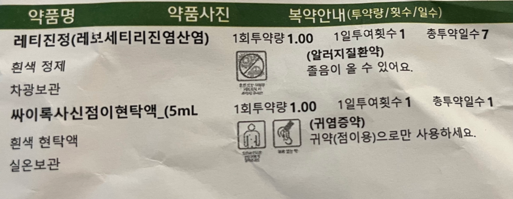 레트린정 - 항히스타민제, 사이록사신점이현탁액 - 감각기관용약으로 사랑니 발치시 큰 영향은 없습니다.