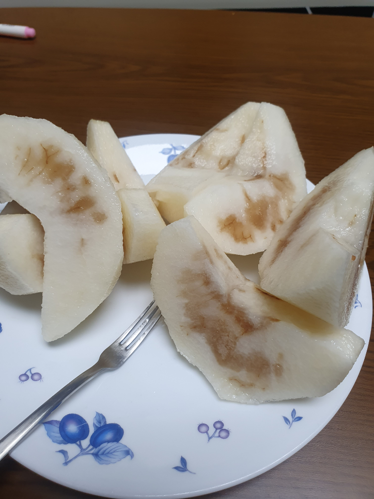안녕하세요. 기쁜향고래73입니다. 사진의 배는 너무 익어서 상한 배입니다. 드시면 배탈이 날 수 있어 드시지 말고 버리셔야 합니다.