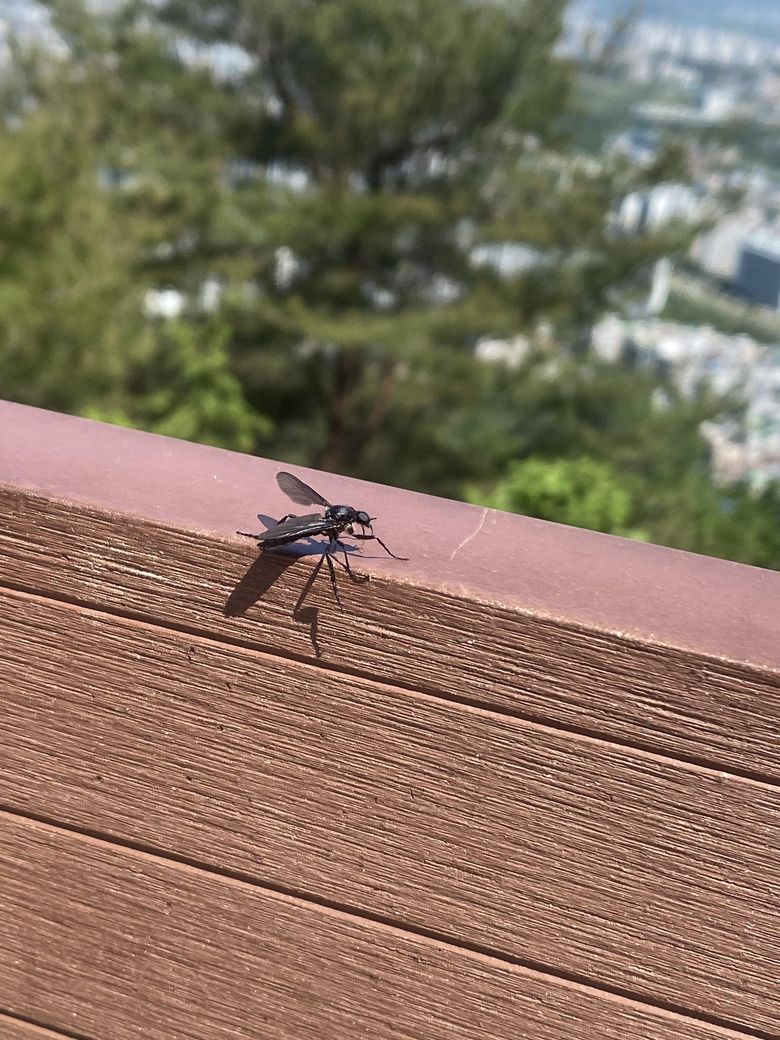 사진상의 곤충은 러브버그라고도 불리는 검털파리로 보입니다. 우리나라엔 9종이 서식한다고 알려져 잇고 느리게 날고 기는 것이 특징입니다. 서식 환경은 위생이 좋지 않은 곳에서 썩은 식물질이나 구더기같은 것들을 먹는다고 알려져 있습니다.
