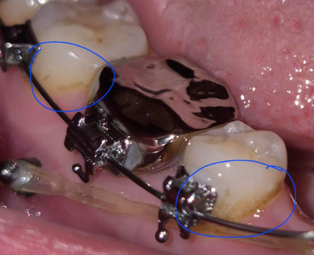 네 현재 치석이 쌓여잇는 것으로보입니다. 교정기 착용으로 양치가 꼼꼼히 되지 않아 생긴 것으로 보이며, 스케일링을 통해 제거가 가능하기에 치과에 방문하여 스케일링 치료를 받길 권합니다.