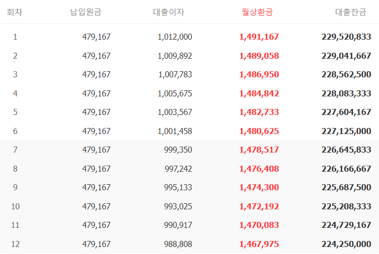 상기 조건으로 1년치 상환금액을 계산하면 다음과 같습니다