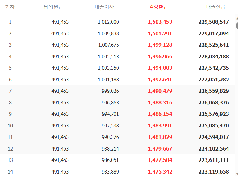 납입원금은 491453원정도이며 이자는 1012000원 정도로 예쌍됩니다.