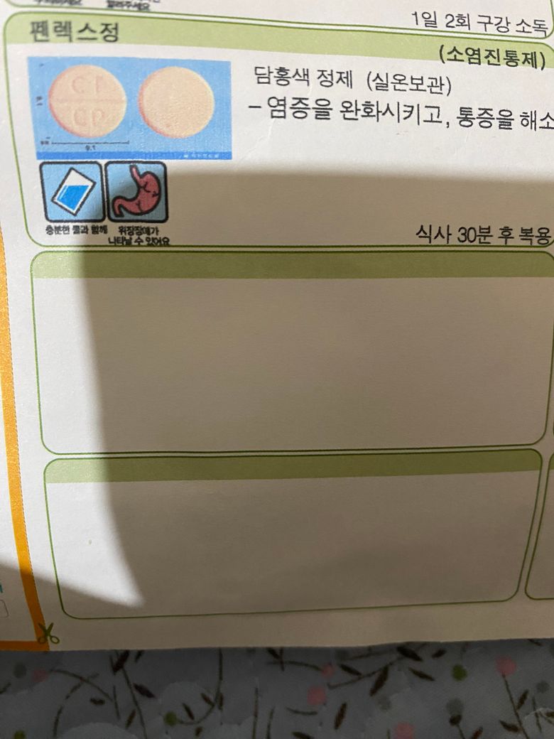 그 다음날 사랑니 발치 전문 치과로 가서 사랑니 발치를 했고(19일) 선생님이 그 때 처방받은 약을 먹으면 된다 하였습니다. 선생님께선 그냥 소염진통제랑 항생제라고만 알고 계시고 무슨약인지 용량이 얼만지는 모르시는데