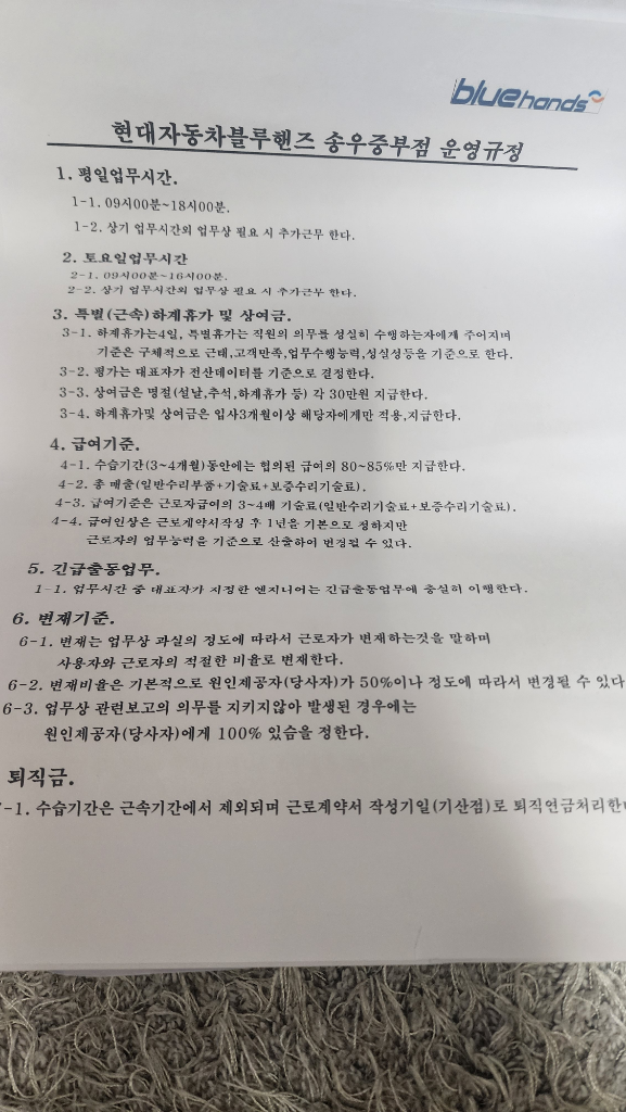 자동차정비라는게 항상 위험한 작업이 많은데. 일하다 다쳐도 병원비를 주지도 않았습니다. 얼굴도 찢어진적 있는데. 직접 약국에 가서 밴드 사다가 붙인적도 있습니다.