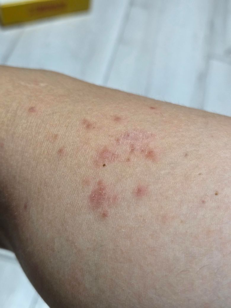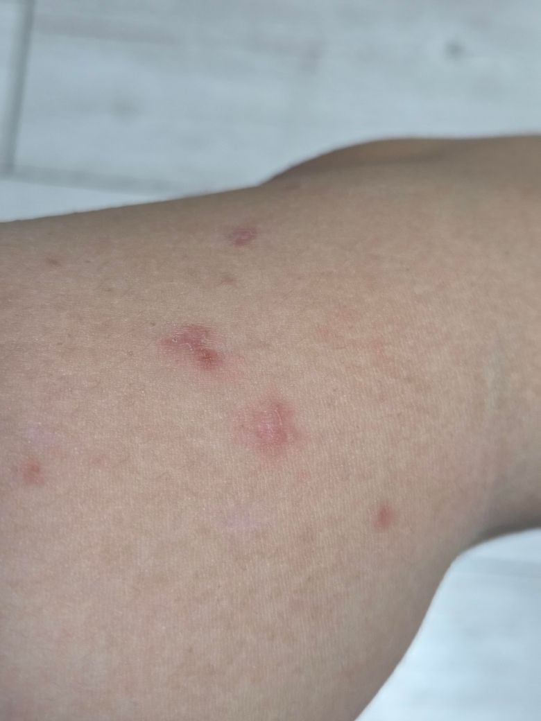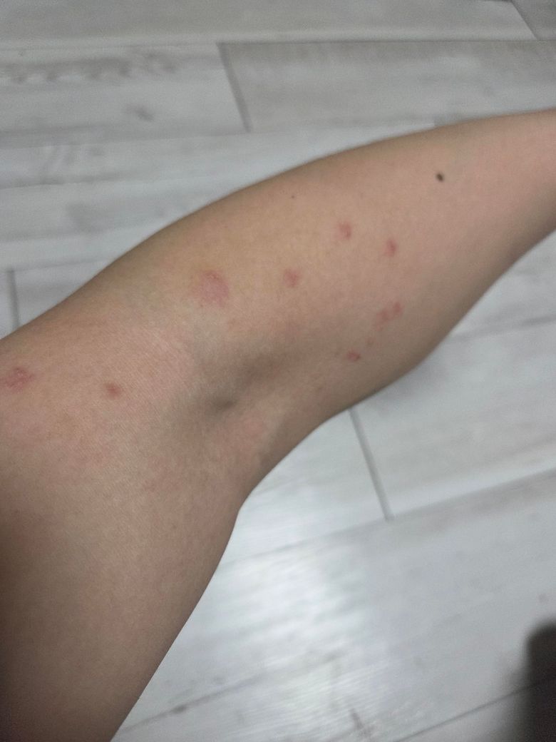 양쪽 팔, 허벅지에 간지럽지 않고 찍은 부분만 저렇게 났는데 뭔지 궁금합니다.. 간지럽거나 하지 않으며 바깥 부분엔 껍질?이 일어나네요