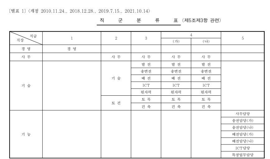 ② 직무는 그 종류에 따라 경영, 사무, 기술 및 기능의 4개 직장으로 대분류한다. <개정 2019.7.15.>