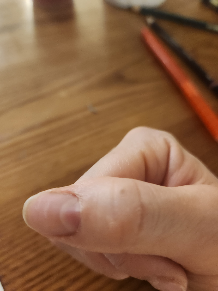 엄지손톱 뿌리 부분이 중간이 봉긋 튀어나왔고 좀 말랑해요 누르면 쿠션감이 있게 눌러져요