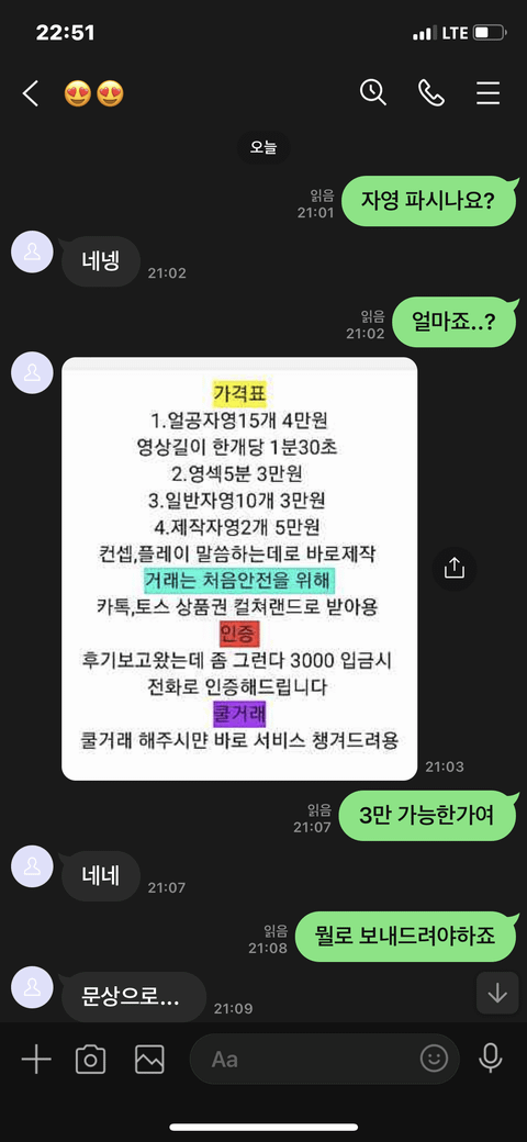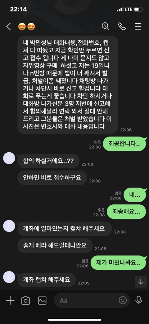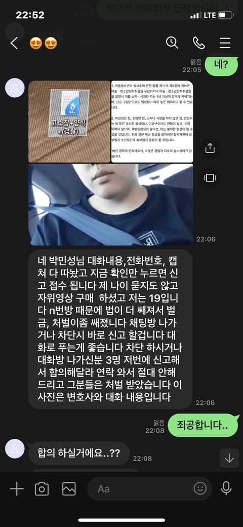 현재 제가 호기심으로 인하여 트위터 자영을 구매한다고 하는 판매글을 보고 라인으로 가능하다라는 것을 보고 라인 친추를 한 뒤에 구매가능하냐 라고 물어보았습니다. 제가 트위터를 보았을 때 상대방이 미성년자라는 것을 인지할 수 있는 정보는 어디에도 없었습니다. 라인에서 상대방이 가격표를 보여주었고 제가 3만원 가량의 문상을 보냈습니다. 문상을 보낸 뒤에는 상대방이 전화번호와 나이를 물어보아 드렸습니다. 서비스 영상이라고 영상을 보냈고 저는 이 영상을 시청 및 다운로드를 하지 않았고 라인 메세지에서도 삭제를 했습니다. 그리고 돌연 자기가 19이고 본인을 아청법 위반(11조5항)을 보여주면서 고소하겠다라고 하였습니다. 덜컥 제가 겁이나서 죄송하다고 하니 선처를 해주겠다 합의해줄테니 돈을 보내라 하면서 라인 전화를 걸면서 어떤 남성분이 받아서 여동생 친오빠다 라며 선처해줄테니 사과하고 돈을 보내라고 했습니다. 트위터에 악의적으로 자영을 판매글을 올려 사기치는 수법 같아 돈은 보내지 않았습니다. 누가봐도 자신의 나이를 보여주지 않고 영상을 보내고 자신이 미성년이다 라며 합의금을 요구한 상대방 2명 남성과 여성이였습니다. 제가 처벌을 받을 수 있는지와 역으로 제가 신고하는데 가능한지 궁금합니다.