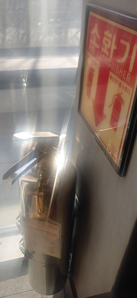 친구랑 시내쪽 카페을 갔었는데 햇빛이 강하게 내리쬐는 곳이 유일하게 앉을 자리였습니다. 앉아서 음료를 마시다보니 소화기도 빛을 받고 있더군요.