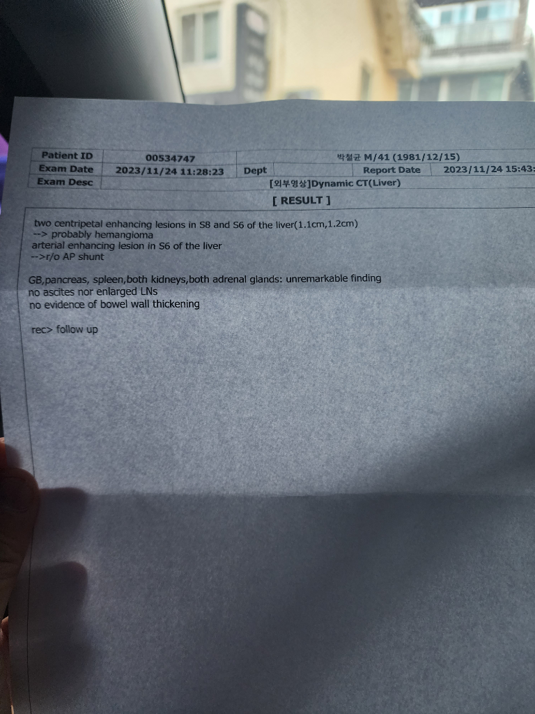 사진에 나타난 복부 CT 판독 결과에 따르면, 간의 S8과 S6 부위에 각각 1.1cm, 1.2cm 크기의 혈관종이 관찰되었습니다. 혈관종은 간에서 흔히 발견되는 양성 종양으로 대부분의 경우 치료가 필요하지 않으며, 주기적인 관찰만으로 충분한 경우가 많습니다. 병원에서 특별한 관리가 필요 없다고 말씀하신 것처럼, 일반적으로 혈관종은 자라지 않거나 증상을 일으키지 않는 경우가 대부분이기 때문에 정기적인 초음파 검사로 크기 변화를 관찰하는 것이 일반적인 관리 방법입니다. 추가적인 관리에 대해서는, 평소 건강한 생활 습관을 유지하는 것으로 충분하실 것으로 사료됩니다. 이는 균형 잡힌 식단, 적절한 체중 유지, 정기적인 운동, 음주 제한 및 흡연 금지를 포함할 수 있습니다.