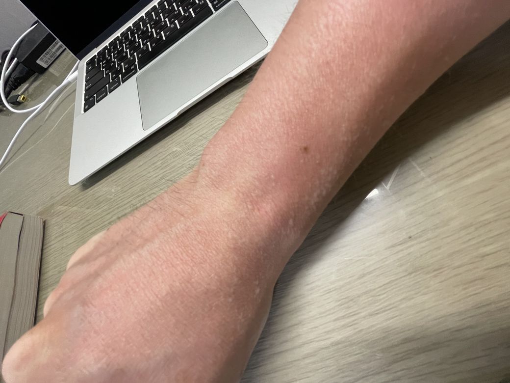 일광화상을 19일에 입었고 2도화상이라고 진단 받았습니다. 현재는 더모타손연고를 바르고 있는데 오늘 갑자기 저렇게 하얗게 무언가 올라옵니다. 자연스럽게 피부가 벗겨지려고 하는 증상인가요?
