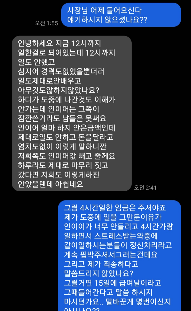 첫날 조금 5분가량 늦게도착해서 7시30분부터 시급 들어간다고 해서 7시30분부터 11시50분? 정도까지 일을 했었습니다 제가 일해본곳이 7개 가량 정도 되는데 도중에 그만두겠습니다 하고 나간곳은 이곳 밖에 없었습니다 인이어가 너무안들리고(저번에 두달가량 일한곳은 인이어가 잘 들리는데 이곳은 고장난건지 지지직 소리만 들렸습니다)스트레스 받는와중에 직원 네분중 두분은 밖에나가 인포에 서있고 카운터에 한분 저혼자 음식서빙 길지서빙 테이블닦고 쓸기등등 해서 두명중에 한 명은 들어와야하는거 아니냐고 속으로 화내고 있었습니다 인이어로 몇번테이블 나갔다 하면 제가 음식서빙 길지서빙은 뒤로하고 제가 가서 테이블 먼저 청소해야 하는데 인이어가 계속 지지직 거리는 소리만 들리길래 직원분을보고 몇번테이블이 나갔는지 확인하려했습니다 그러더니 직원분들이 저한테와서 왜 안치우냐고 정신차리세요 이러면서 화내시길래 한시간 두시간 세시간 네시간 버티다 도저히 못하겠어서 사장님께 그만둔다 말씀드리고 나왔었습니다 저도 중간에 그만둔건 제가 잘못한게맞고 죄송한일이여서 사장님께 죄송하다고 일한 임금은 주셔야 겠다고 말씀드렸습니다 근데 사장님께서 급여는 15일날에 들어가니 기다리라하시더라고요 18일가량 넘게 기다리신 후에 답장이 없으시길래 그래도 삼일안에는 보내주시겠지 하고 3일을 더 기다렸습니다 그런데도 안보내주시길래 문자하나 남겨드렸고 그다음날도 없으시길래 사장님께 문자남겨드렸었습니다 그런데도 다음날까지 연락없으시길래 전화한통 드리니 귀찮다는듯이 받으시더라고요 그래서 정중하게 사장님 15일날이 급여날이라 하셨었는데 아직 들어온게 없습니다라고 말씀드렸었습니다 그러니 알겠다고 하고 끊으시더라구요 그 뒤로 40분뒤에 주말이라 확인 못해서 확인하고 준다고 갑자기 말씀하시는겁니다 그 뒤로 이틀동안 연락없으시더니 이틀후 확인하셨냐고 문자남겨드리니 오늘 들어갈꺼에요~라고 문자남기시더라구요 그러더니 다음날 새벽 2시까지 보내시질 않으시는겁니다 그리고 오늘 연락드리니 장문으로 이렇게 연락오시네요