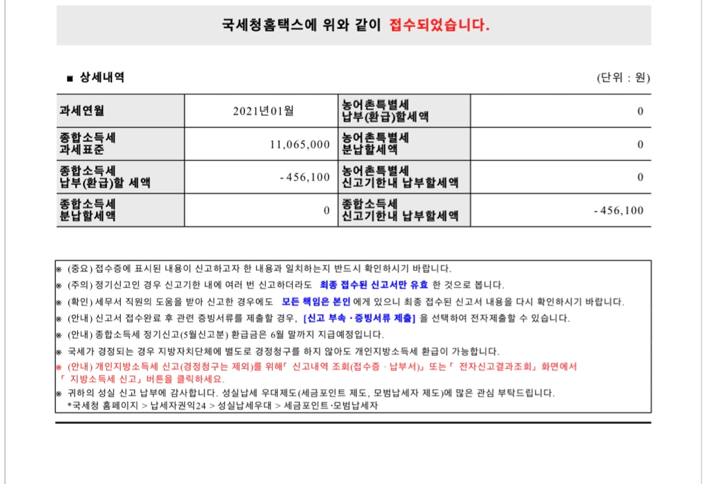 따라서 총 환급세액은 501,710원이고 환급은 국세와 지방세가 따로 지급됩니다.