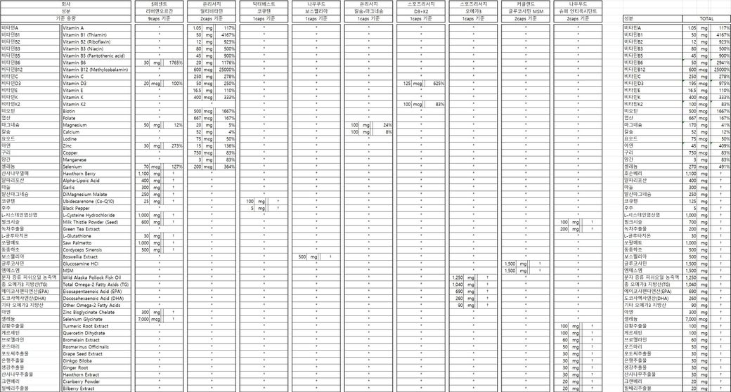 현재 영양제의 개수가 너무 과다하며, 대부분이 해외직구제품이나 인터넷 유통제품으로 보입니다. 이들은 장기간 복용 시 오히려 불순물이나 중금속으로 인해 간손상 및 신장손상을 유발할 수 있어 주의가 필요합니다. 되도록이면 식약처의 엄격한 규제를 거치는 약국유통제품을 복용하시는 것을 권장드립니다.