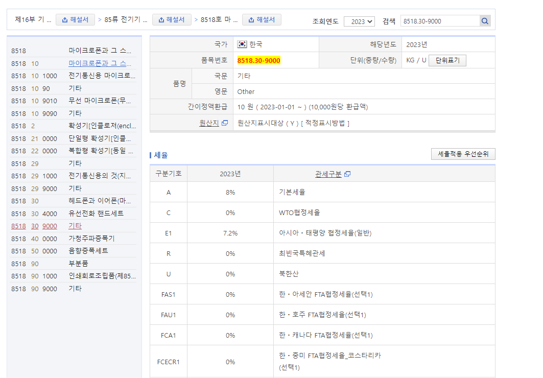 다만, 이를 초과하는 물품에 대하여는 관,부가세를 납부하셔야되며, 헤드셋의 경우 HS code 8518.30-9000(기타 헤드폰, 이어폰)에 분류하게 되며 이러한 물품의 관세는 0% 부가세는 10%입니다.