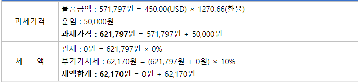 운송료가 50,000원인 경우 아래 세금 계산을 단순 참고 하시되 정확한 세액은 물품의 금액, 운송료 및 환율 등의 조건에 따라 상이합니다.