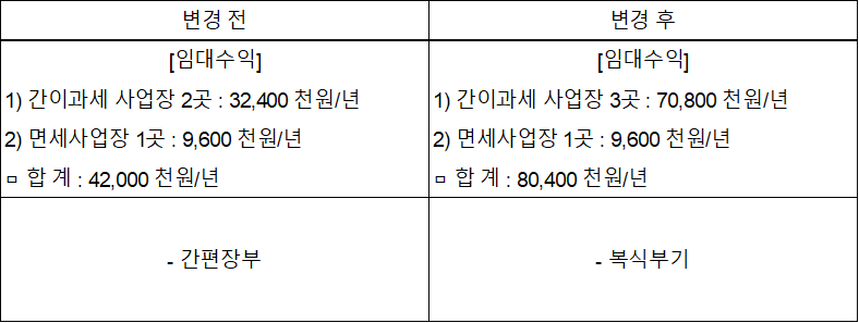 임대사업자로 아래와 같이 간이과세 사업장 1곳이 늘어날경우 복식부기 외 종합소득세 신고시 변경 부분이 어떤게 있는지 문의 드립니다.