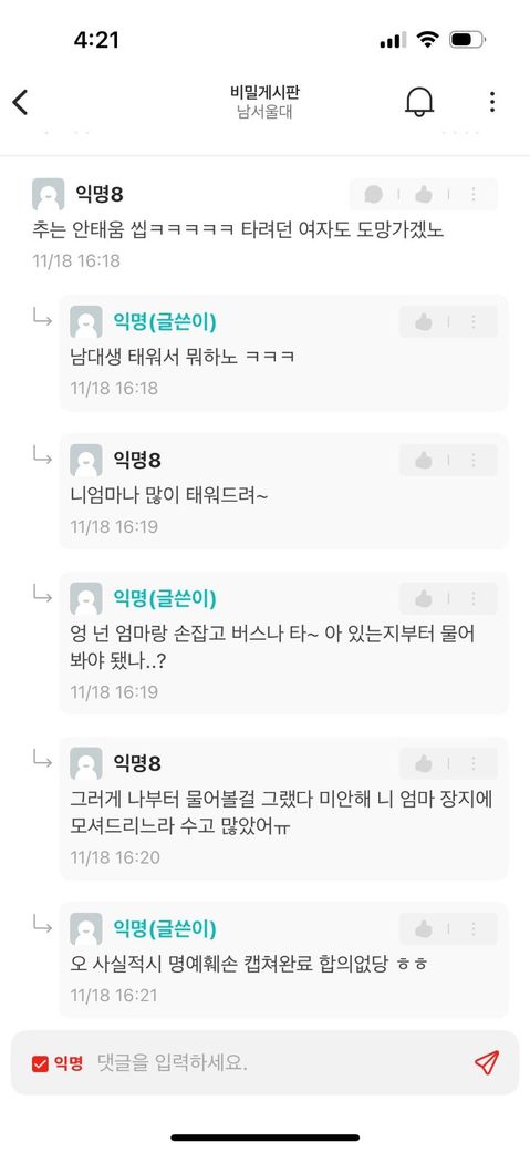 글쓴이가 자기 차에는 여자만 태우겠다며 "추는 안태움" 이라는 글을 쓴 것을 보고 단 댓글입니다, 대화 이후 글쓴이는 명예훼손으로 신고하겠다는 댓글을 쓴 채 모든 글을 삭제한 상태입니다. 명예훼손이 성립될까요?