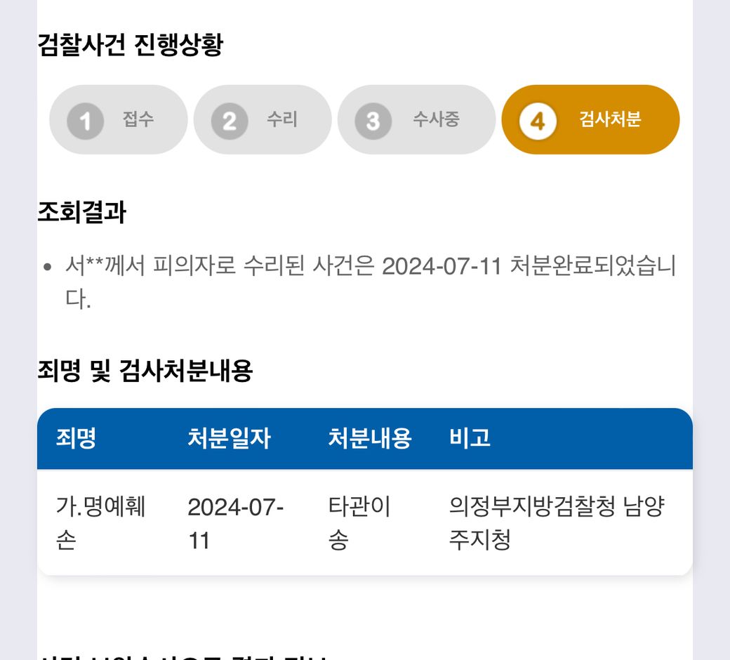 검사처분 나왔다고 뜨는데 의정부지방검찰청으로 이송됐다고만 뜨고 결과는 안 나오네여