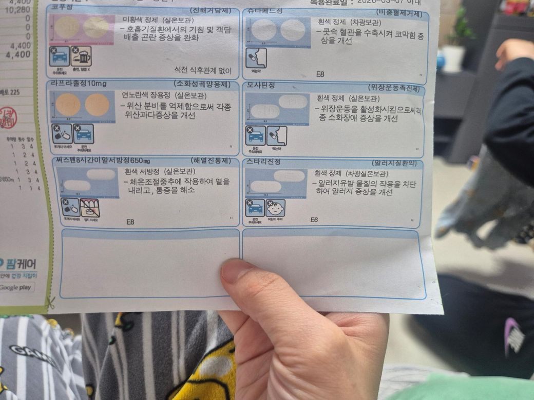 사진에 보이는 약은 다음과 같습니다. 미콜헥스정(가래 배출을 돕는 거담제), 슈다페드정(코막힘 완화제, pseudoephedrine), 라프라졸정 10mg(위산분비 억제제, proton pump inhibitor 계열), 모사틴정(위장운동 촉진제, mosapride), 세즈펜 8시간 이알서방정 650mg(아세트아미노펜 성분 해열진통제), 스타라진정(항히스타민제).