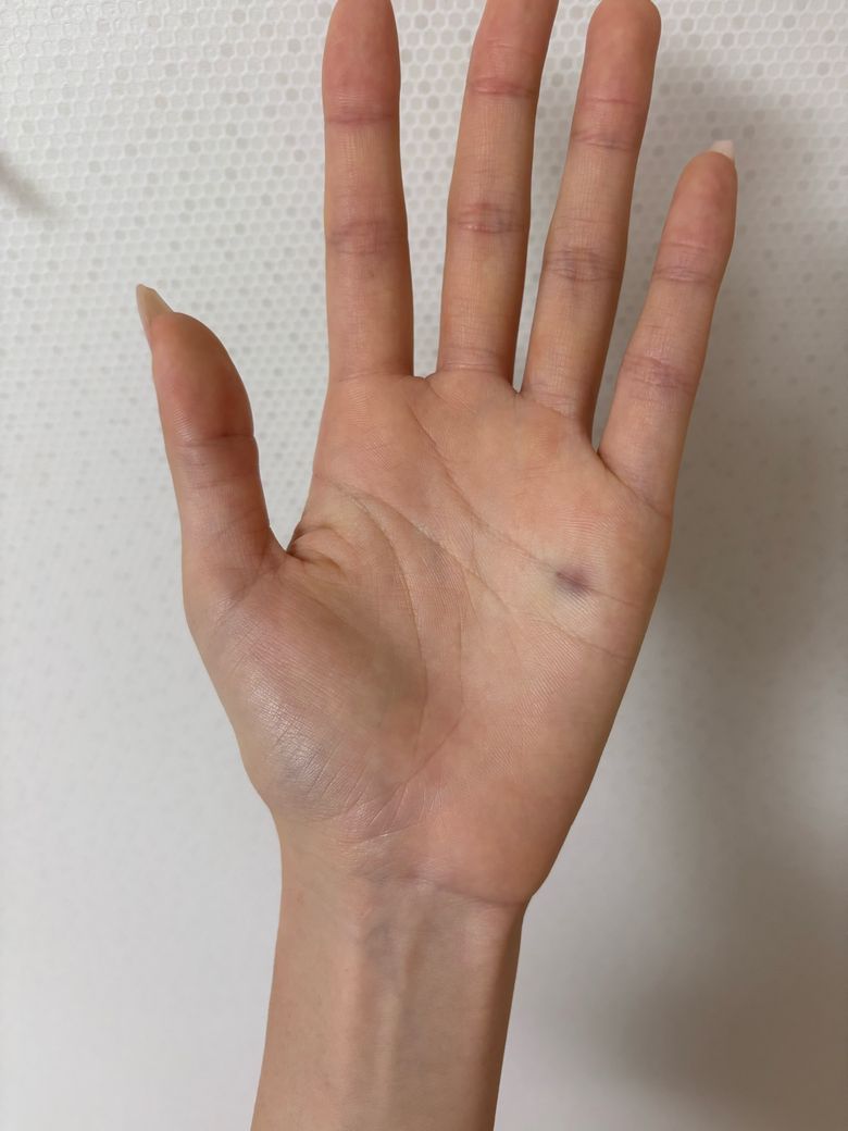 18일 오후 4시 정도에 맞았고 갑자기 몇시간 지나고나서 멍이 저렇게 생겼고 왼쪽은 이번이 3번째 주사입니다 신경이 건드려진걸까요?