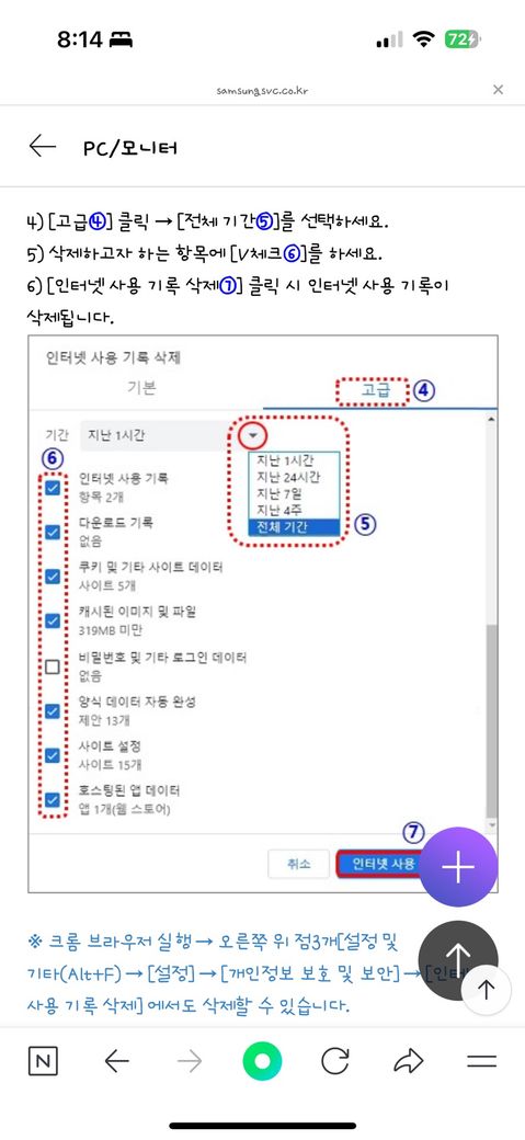 컴퓨터로 인터넷 방문기록 24시간 이내 삭제하시면