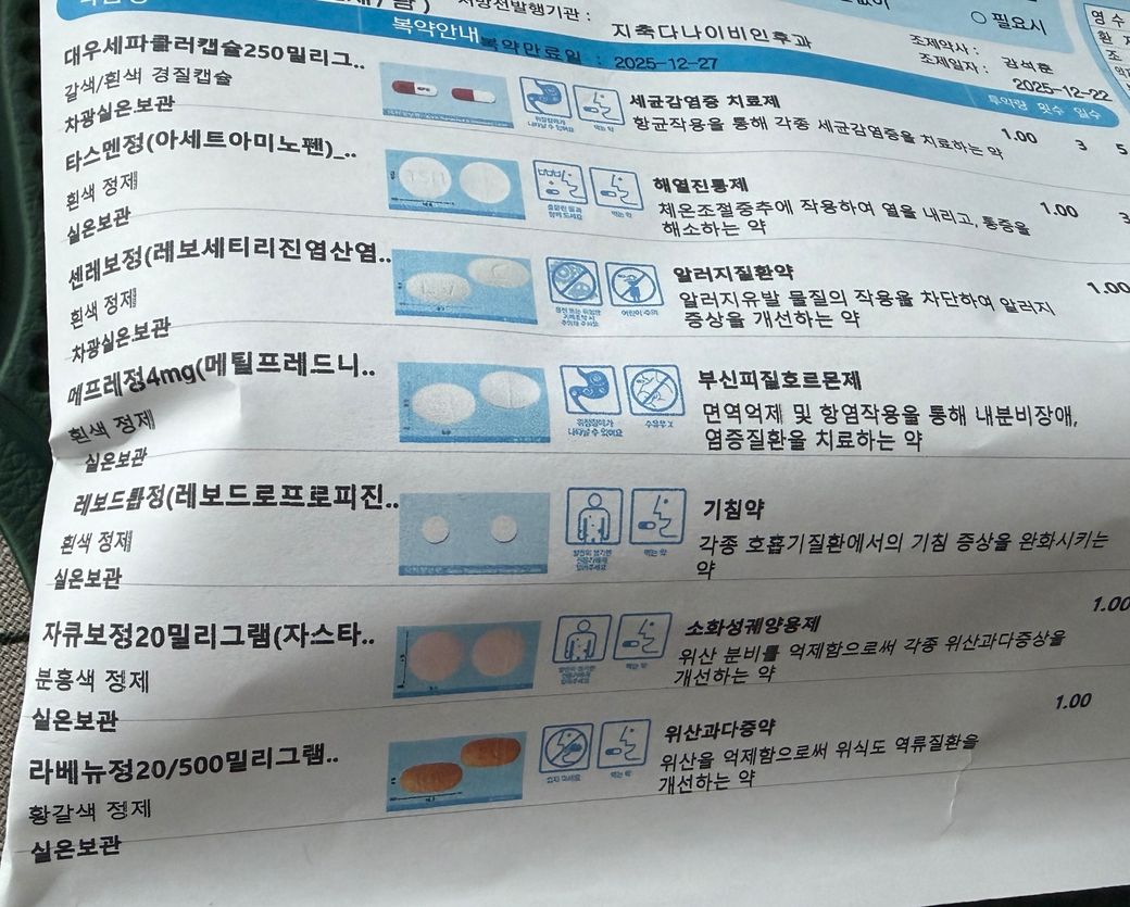 사진 처방 조합에서 같이 피하셔야 할 것은 알레르기약이 두 가지로 겹친 부분이라서 에피나스틴 성분 약과 레보세티리진 성분 약은 동시에 드시지 말고 한 가지만 선택하시는 것이 좋습니다. 또 록소프로펜 성분 소염진통제와 메틸프레드니솔론 성분 스테로이드를 함께 쓰면 위 자극과 속쓰림 위험이 올라가니 식후 복용을 지키고 위장약은 함께 복용하셔도 됩니다. 헤르페스 치료제인 발라시클로버는 세파클러 항생제와 같이 복용해도 큰 상호작용 문제는 흔하지 않습니다. 마지막으로 타스멘처럼 아세트아미노펜이 들어간 해열진통제를 드시는 동안에는 추가 감기약이나 두통약에 같은 성분이 또 들어있는지 중복만 꼭 피하시면 됩니다. 감사합니다.