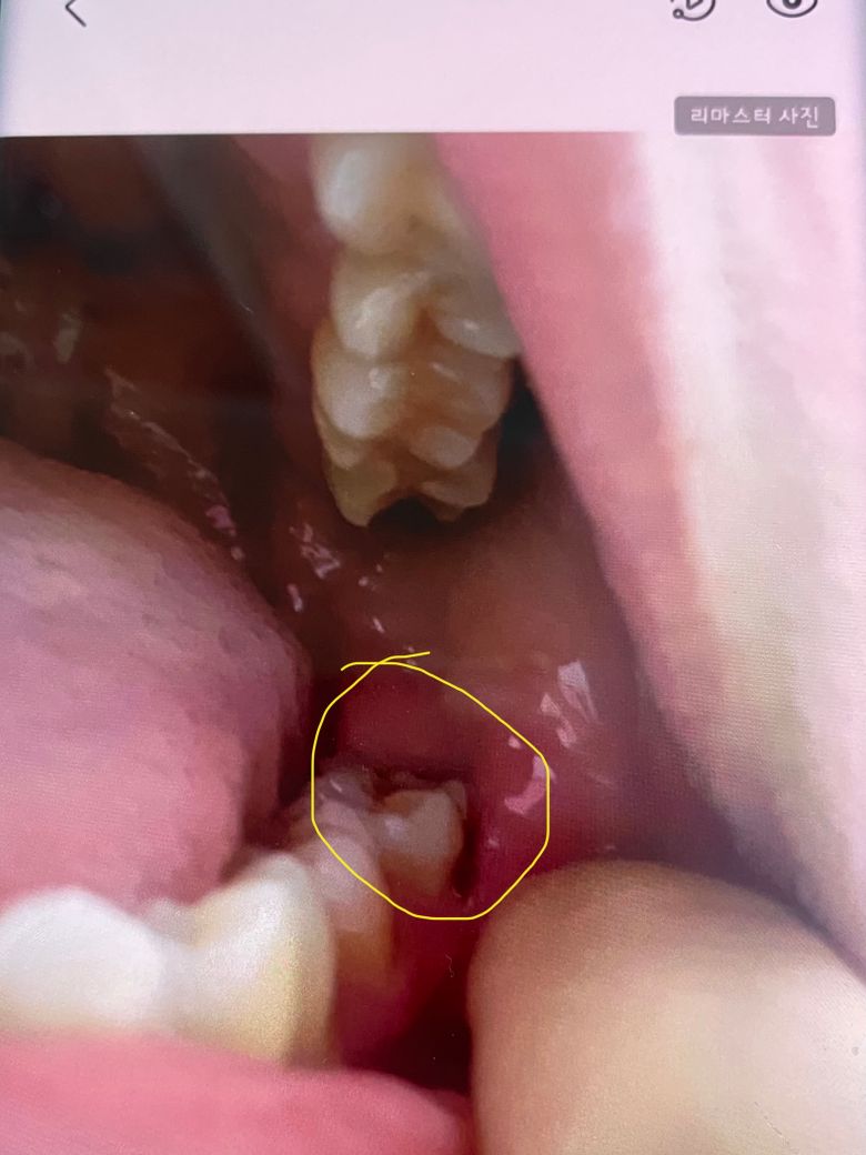 일단 지금 사진으로는 잘 보이지 않습니다. 정확한 평가를 위해서는 더 선명한 사진이 필요합니다. 현재 너무 걱정이 되신다면 다시 치과를 방문하여 해당 부분에 대한 검사를 해보는 것이 가장 좋아 보입니다.