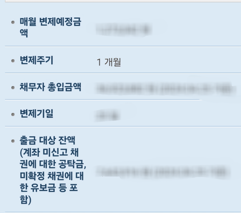 출금대상잔액은 입금한 변제금 중 채권자에게 지급되지 못하고 있는 금액(계좌미신고, 미확정채권유보금)입니다. 구체적인 것을 확인하고 싶다면 법원에 연락해서 물어보실 수 있을 것입니다.