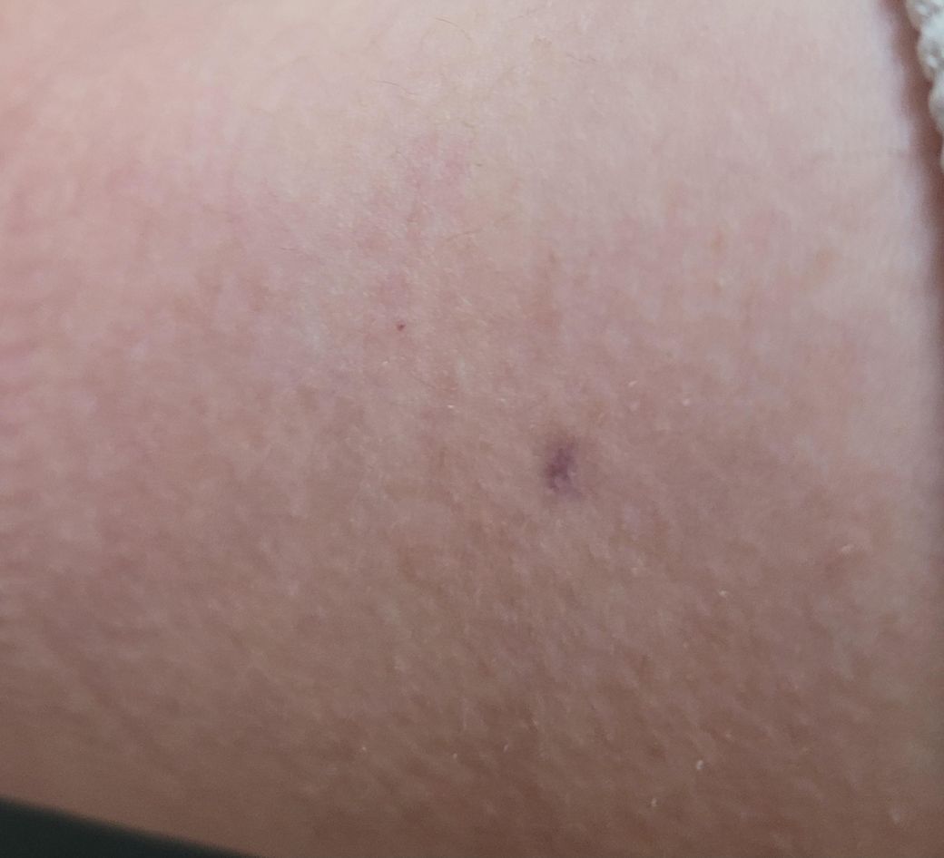 사진처럼 약간 보라색 처럼 머가 생겼는데요 촉감은 아예없는데 이거 멀까요 점은 아닌것같고요 멍든걸까요 답변주시면 감사할것같습니다