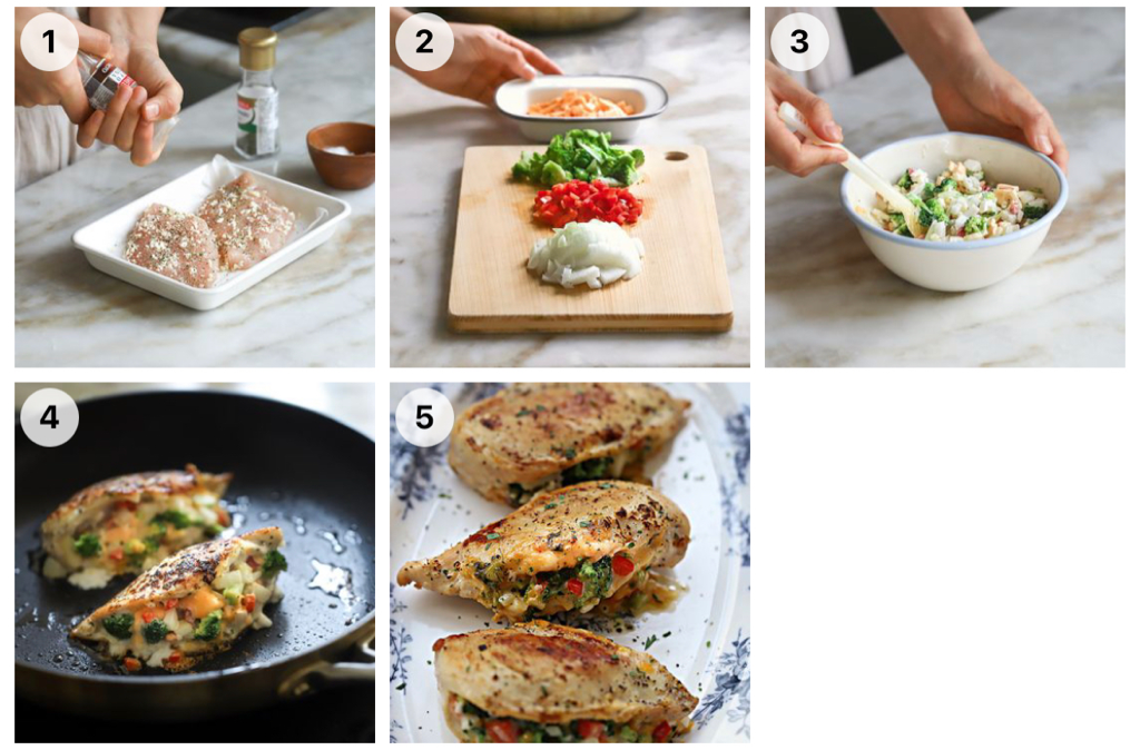 3. 썰어놓은 야채들과 체다치즈, 마요네즈, 소금, 후춧가 루, 모차렐라 피자치즈를 볼에 넣어 골고루 섞어준 후 닭가슴살 속에 넣어주세요.(이쑤시개로 고정시키면 내 용물이 밖으로 나오는 것을 줄일 수 있어요.)