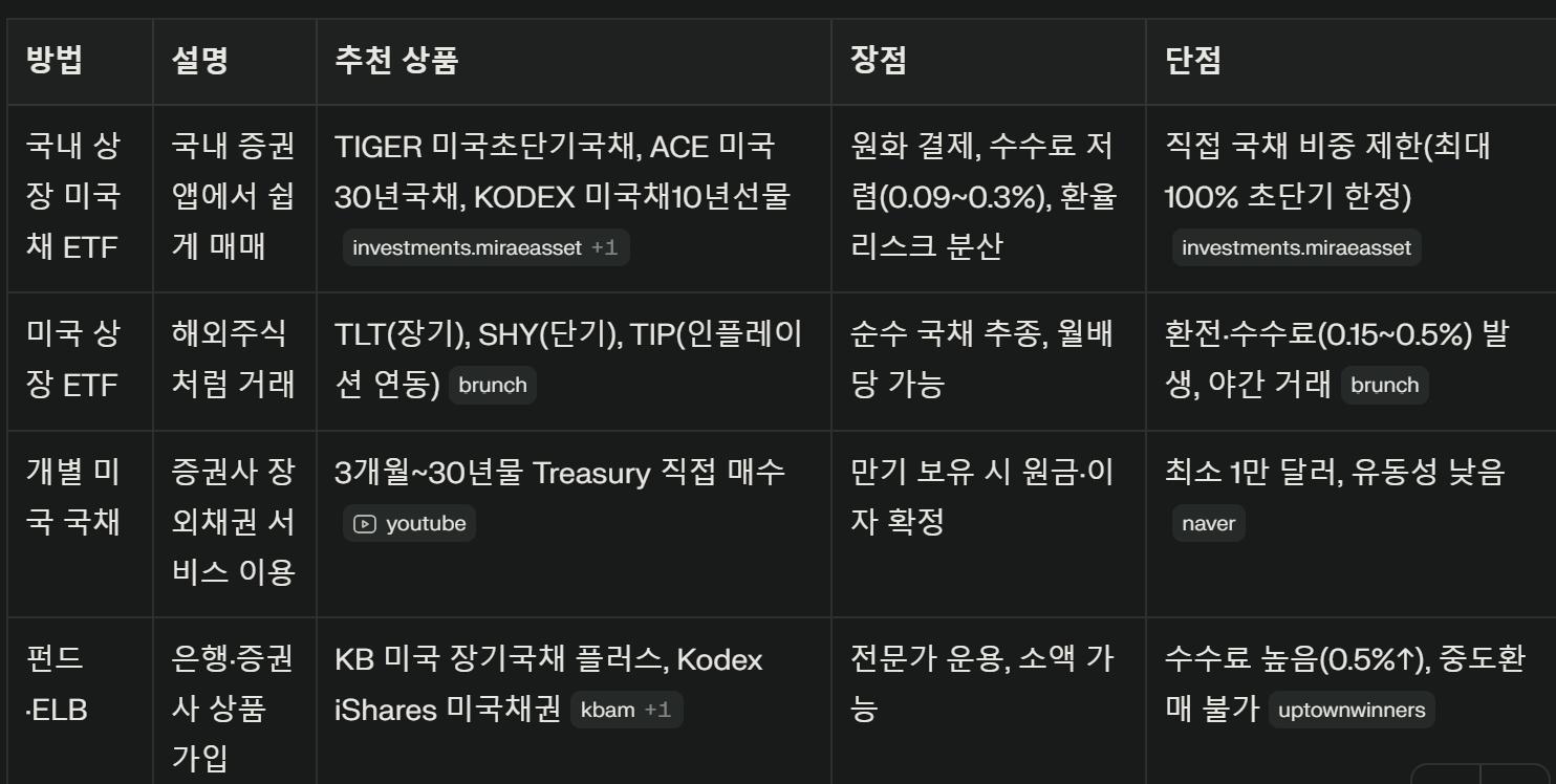 한국 거주민이 미국 채권(주로 미국 국채)에 투자하는 가장 현실적인 방법은 국내 증권사를 통한 해외주식 계좌 개설 후 ETF나 개별 채권 매수하는 방법이 직관적입니다.