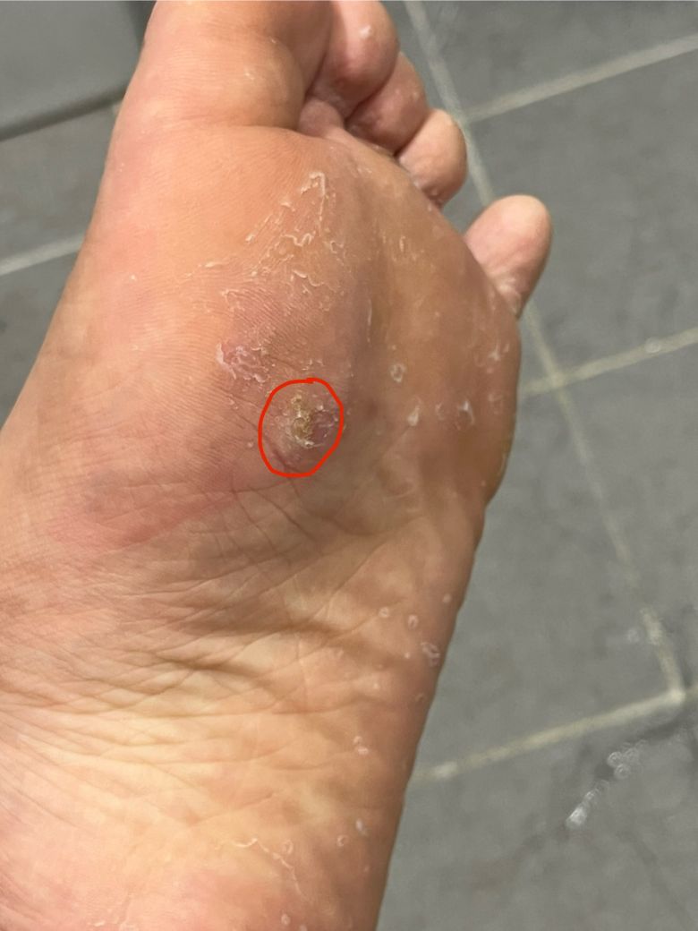사진과 설명을 보면 발바닥에 하얗게 각질이 일어나고 동그라미 친 부위에 딱딱하거나 물집처럼 보이는 병변이 있습니다. 이 부위가 누르거나 걸을 때 통증이 있다면 대표적으로 무좀의 가능성이 높습니다. 무좀은 곰팡이균 감염으로 발바닥이 하얗게 각질이 일어나고 갈라지거나 물집 또는 딱딱한 각질이 생기며 가려움증이나 통증이 동반될 수 있습니다. 특히 각질형 무좀이나 물집형 무좀은 발바닥에 두꺼운 껍질이나 물집이 생기면서 누르면 아플 수 있습니다.