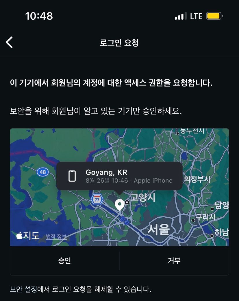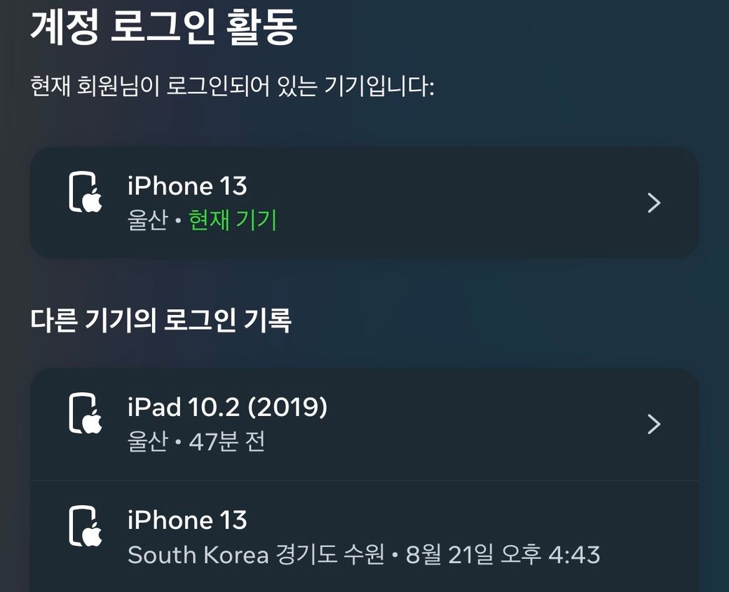 엊그제에서 어제 넘어가는 새벽에 봤을 때만해도 제가 있던 울산 지역에 내 기기가 있다고 찍혔습니다 근데 8월 21일에 경기도 수원에서 로그인한 흔적이 있어서 2차 인증 설정하고 다음 날 아침에 비밀번호를 변경하고 제가 로그인하자마자 경기도 고양에서 로그인을 요청한다고 해서 ‘뭐지?’ 생각만 하고 따로 조치를 취하지 않았습니다 어제 저녁에 다시 확인해보니 내 기기가 경기도 고양으로 찍혀있었고, 로그아웃을 하고 다시 해도 변하지 않아서 오늘 아침에 다시 확인했는데 내 기기가 경기도 수원으로 찍혀있습니다 현재 비밀번호를 다른 걸로 다시 변경했는데 단순 내기기 위치 오류인 건가요? 다시 울산으로 돌리는 방법은 없을까요?