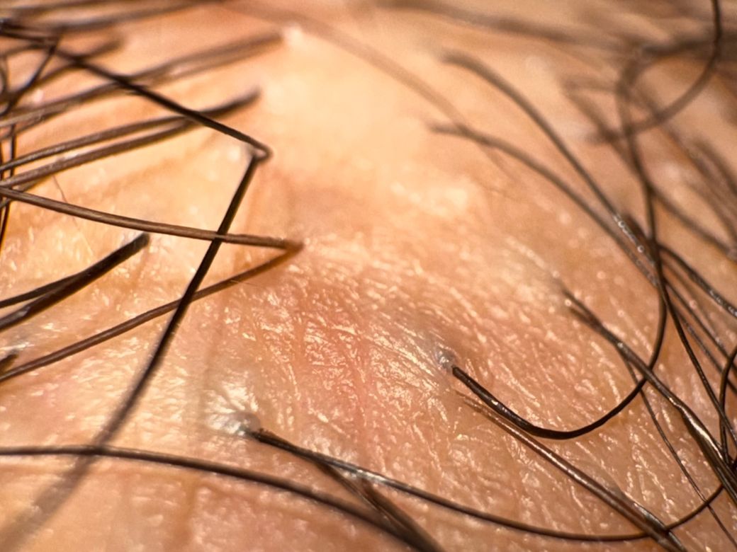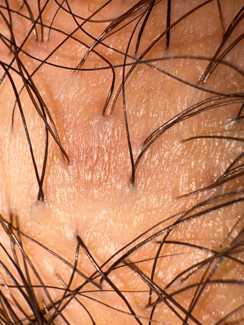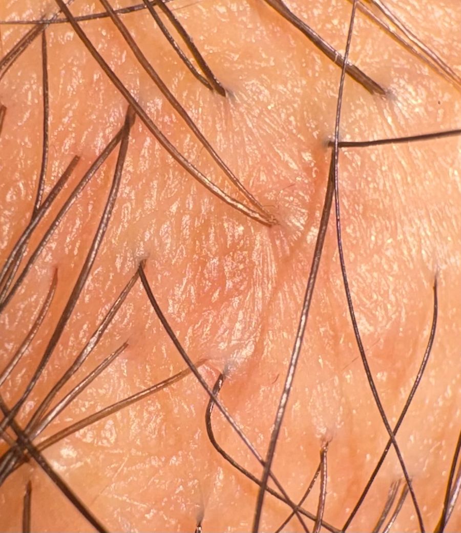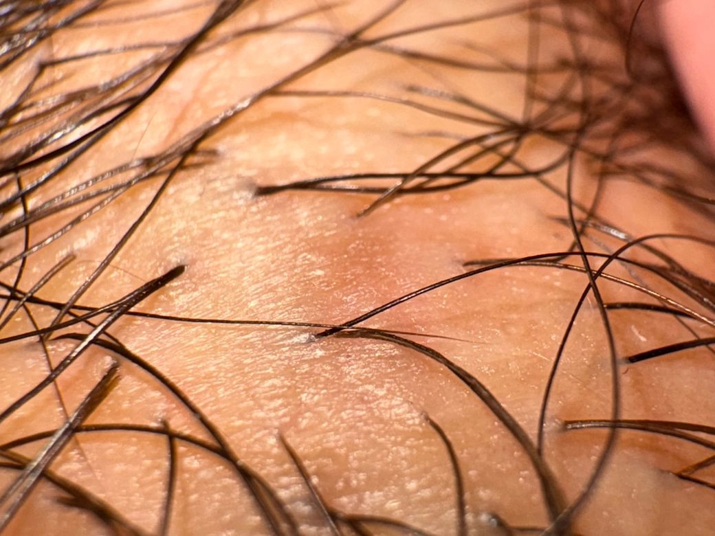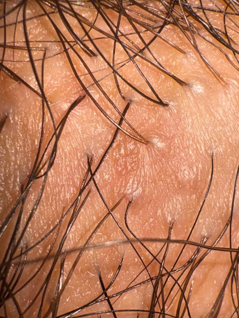 사진에서 보이는 병변은 모낭 중심으로 작게 돌출된 1 mm 내외의 구진 형태이며, 표면이 매끈하고 색이 피부색 또는 약간 회백색에 가깝습니다. 전형적인 곤지름(콘딜로마)에서 보이는 불규칙한 표면, 사마귀처럼 거칠고 융합되는 양상, 꽃양배추 모양의 증식 소견은 현재 사진에서는 확인되지 않습니다.