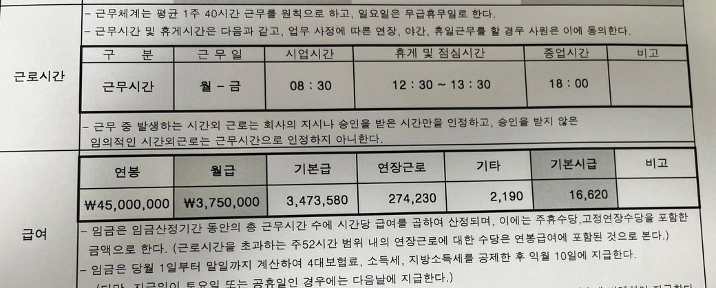 → 기본급 (40시간 근무기준) 3,473,580원 / 연장근로 274,230원 / 기타 2,190원 / 기본시급 16,620원