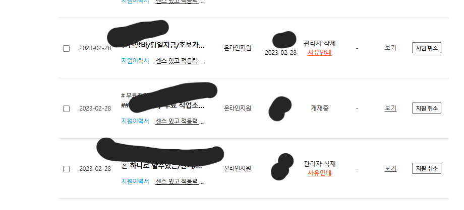 지원 내역 중 위 카톡 메세지 업체 있습니다. 알바몬에서 제 아이디로 들어가서 사기 업체들은 삭제하고 전부 지원취소 했더라구요. 오늘 아침에 알았습니다ㅠ