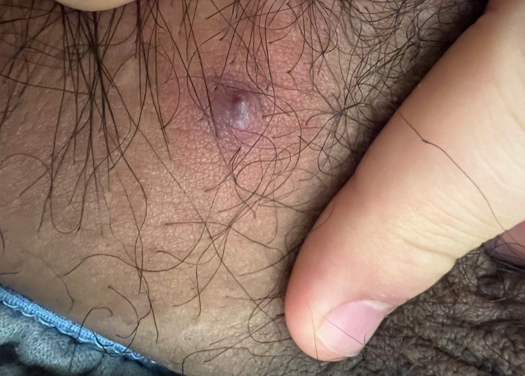 사진상 병변은 음모가 있는 부위의 피부에 국한된, 약간 붉고 보랏빛을 띠는 단일 융기성 결절로 보이며 중심부에 염증성 변화가 의심됩니다. 일반적인 성병과 같은 특성 보다는 현재 소견상 가장 가능성이 높은 것으로 모낭염 또는 초기 피부 농양(종기)입니다. 털이 있는 부위에서 세균 감염으로 발생하며, 압통이 있고 점차 붓거나 고름이 차는 형태로 진행할 수 있습니다. 억지로 짜는 경우 염증이 악화되거나 주변으로 퍼질 수 있으므로 자가 압출은 피하는 것이 안전합니다.