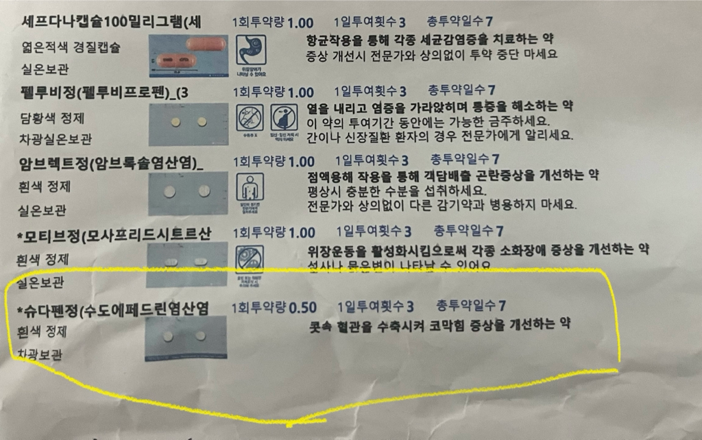 위의 첫번째사진의 약들과 코를 말리고 코막힘증상을 개선하는 슈다펜정을 함께 복용을 하셔도 괜찮습니다. 항생제가 첫번째 사진에 있기에 임의로 변경하면 안되며 처방일수를 지켜서 끝까지 복용하길 권장드립닏.