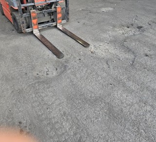 야외 작업 구간 작업 중 아스팔트 파여있고 전동 지게차 사용 중