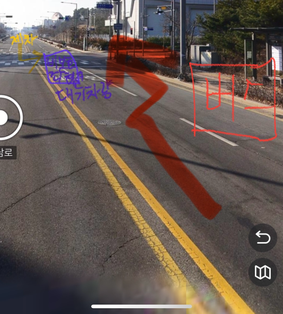 제 차 건너편에는 1차선에 비보호 좌회전 대기중인 차량이 있었고, 2차선에는 버스가 정차중이었습니다.