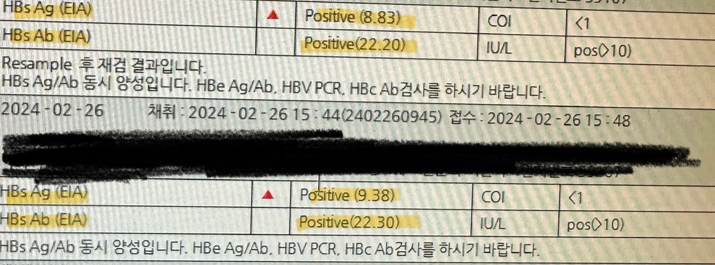 2월에 헌혈을 했는데 b형간염 항원이 양성이 나와서 병원에 가서 다시 한 번 검사를 했고 8~9정도로 양성이 나왔습니다 pcr도 재검사 했는데 결과는 음성입니다