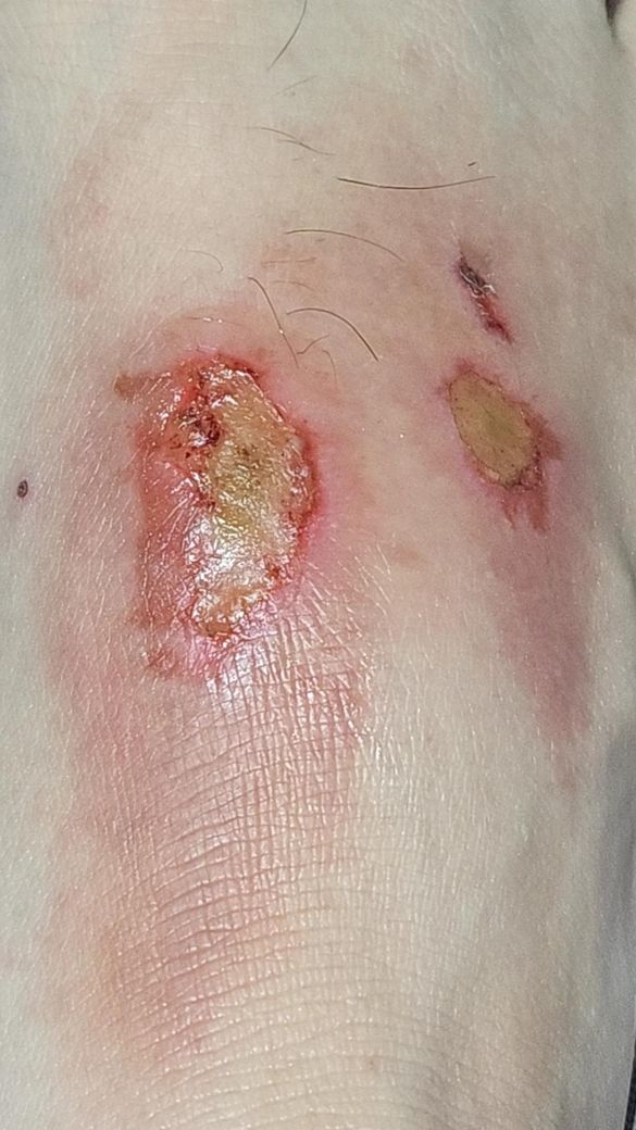 사진과 같은 상태에서 연고바른상태로 메디폼 붙이고 있었더니 딱지가 다 흐물흐물해져서 전부 나가 떨어져버렸어요 그 부위에는 붉은색진피들이 보이구요